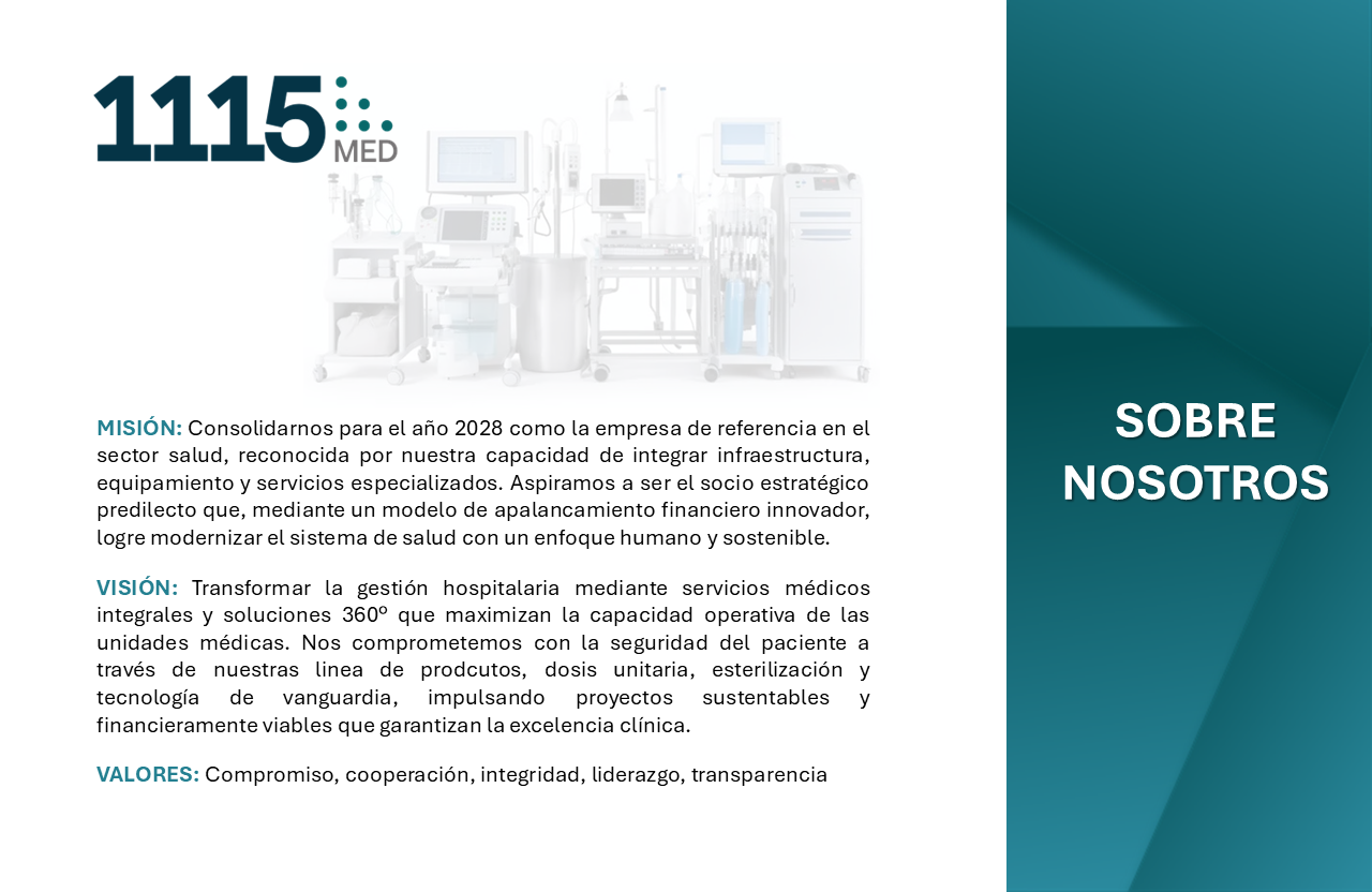 Somos una empresa dedicada a promover servicios integrales en el sector salud, ofreciendo soluciones especializadas y un portafolio que abarca desde laboratorios clínicos, procesos de esterilización, alta desinfección en CEyE, quirófanos, unidades médicas, infraestructura y equipamiento médico.